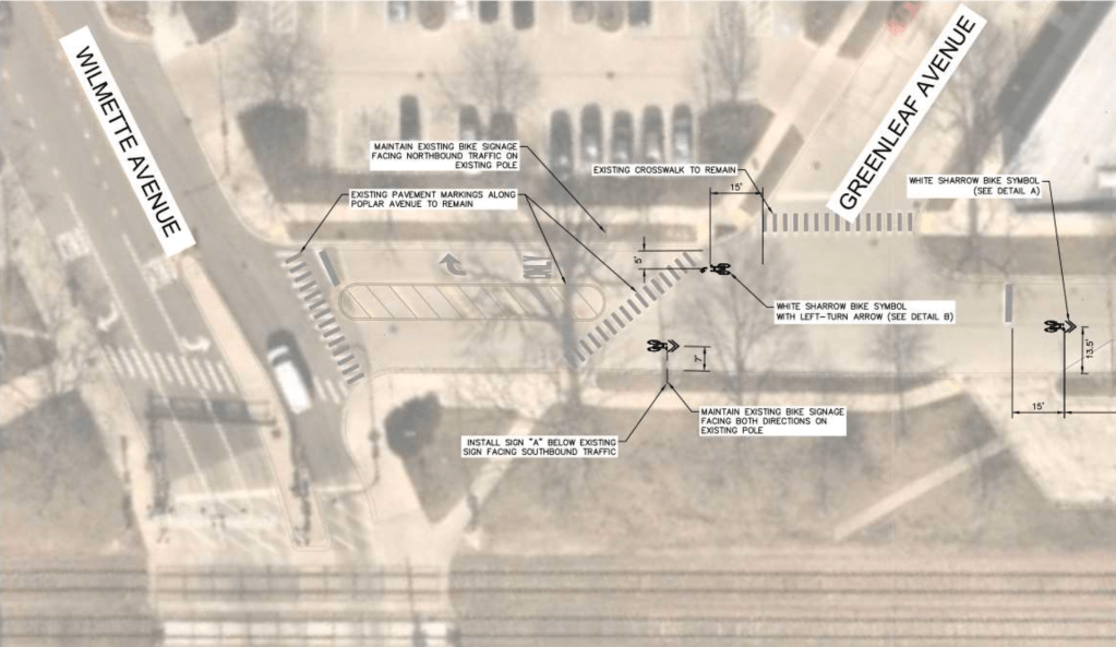 WILMETTE – After striping Greenleaf Avenue last week there are more sharrows* in the works in Wilmette. Park and Washington Avenues and Poplar Drive are getting them too, probably in the summer of 2023.