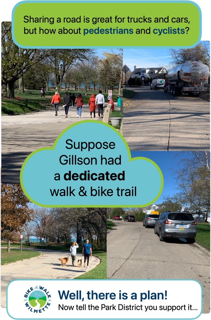 - The alternate path would be at least 8’ wide and more aligned with how people walk in the park. People tend to walk in Gillson in groups of 2 or more or with dogs. The Park District’s 5’ proposed sidewalk is just too narrow to accommodate them safely, especially when passing others going in the opposite direction. Just as on a Village sidewalk, someone has to step to the side to let the others pass. In this case, they’d be stepping into the bike lane—dangerous! Bikers would then be forced into the car lane—also dangerous!
