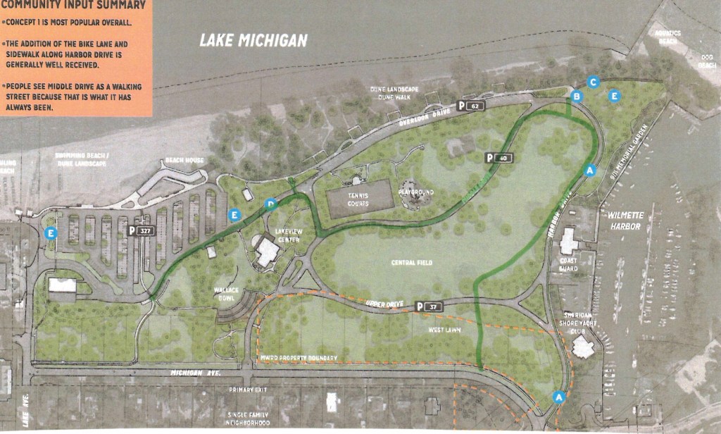- The alternate path offers better connection through the park. It flows into Middle Drive, which is currently a little-used walk and bike way and could wind around to end up at the beach house and the new bike and pedestrian path at the north end of the park. By contrast, the Park District’s proposed bike lane ends at Overlook Drive, forcing bikers to use the sidewalk along the lake or ride behind the row of parked cars. Neither is a good choice. The sidewalk is often crowded with people strolling or walking with their dogs to the dog beach. Mixing with pedestrians and dogs on leashes or riding behind a row of cars entering or exiting are potentially hazardous for bikers
