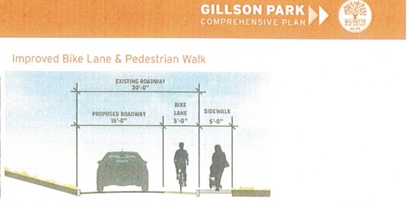 The Wilmette Park District is planning infrastructure improvements in Gillson Park. They propose a bike lane adjacent to the car lane in the existing roadway along Harbor Drive and a 5’ wide new pedestrian sidewalk next to the bike lane. They think that this is adequate and will solve the public’s long time demand for better biking and walking in Gillson.